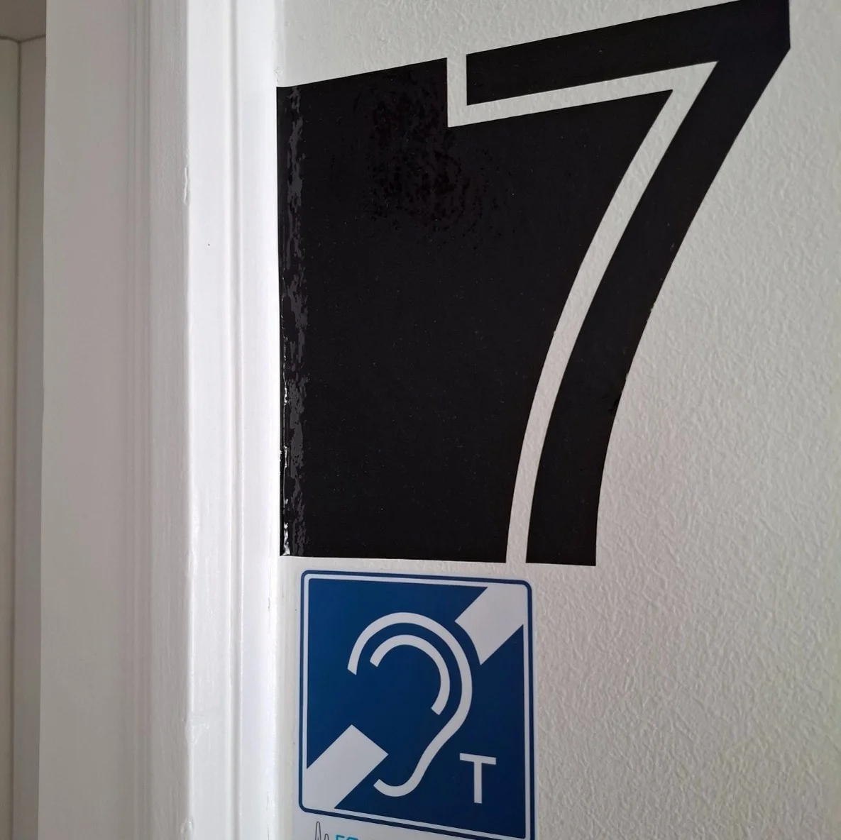 Ta modra slika, ki jo lahko vidite ob številki učilnice, je znak za slušno zanko. Vidite ga lahko nalepljenega pri vseh učilnicah na Ljudski univerzi Kranj, in sicer na obeh lokacijah: Cesta Staneta Žagarja 1 in Cesta talcev 7.